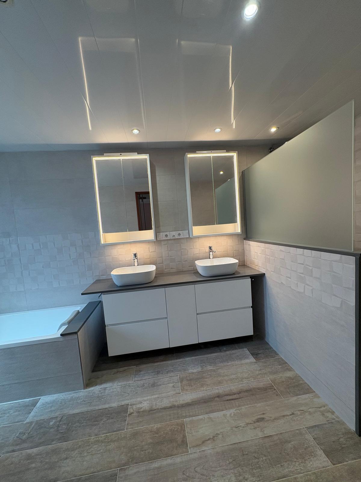 Este conjunto ofrece gran capacidad de almacenamiento, una estética muy limpia y una combinación de blanco y gris que encaja perfectamente con el resto del diseño. Los espejos camerino con luz LED integrada aportan funcionalidad y una iluminación ideal para el día a día.