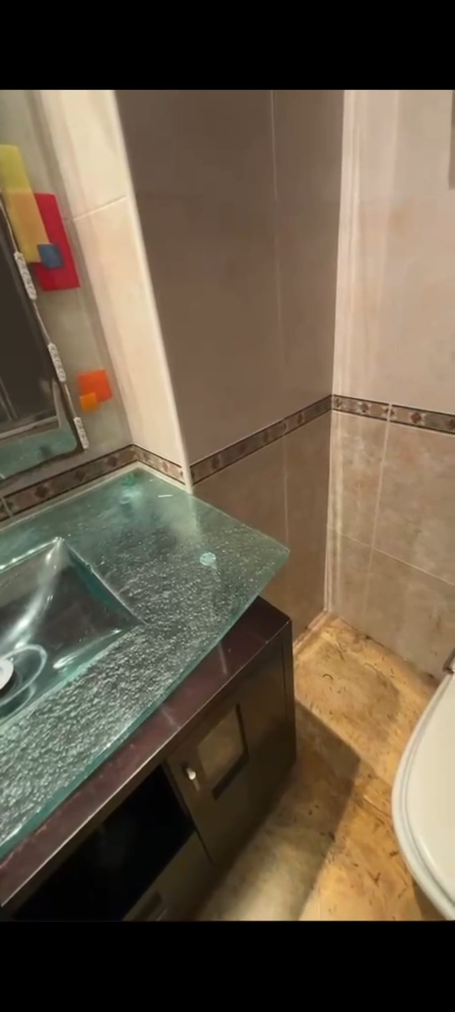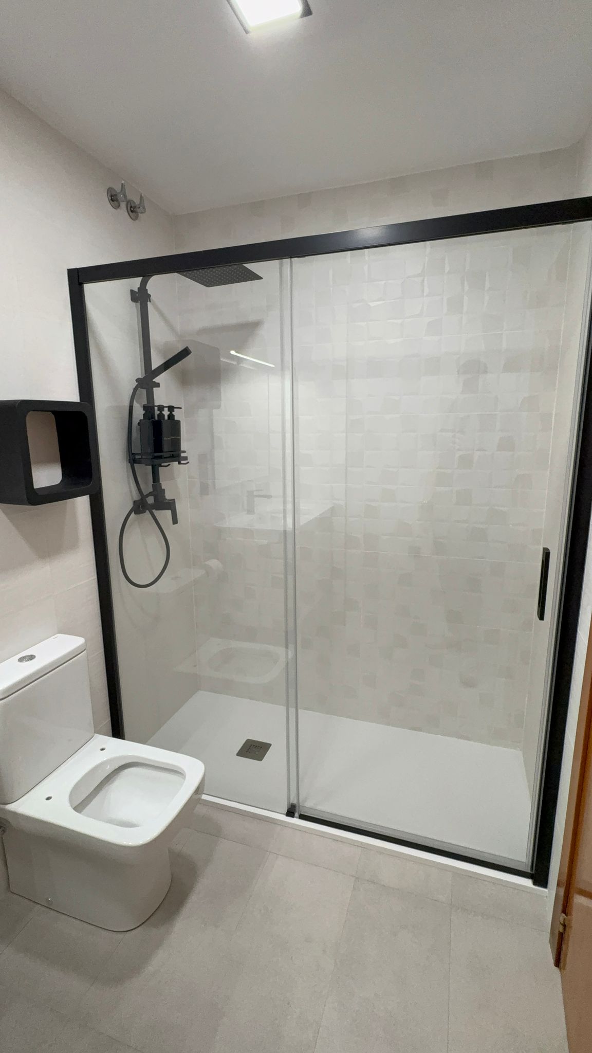 • Mampara: Modelo Florida, compuesta por una hoja fija y una corredera con perfilería negra y vidrio transparente de 6 mm (incluye tratamiento antical).