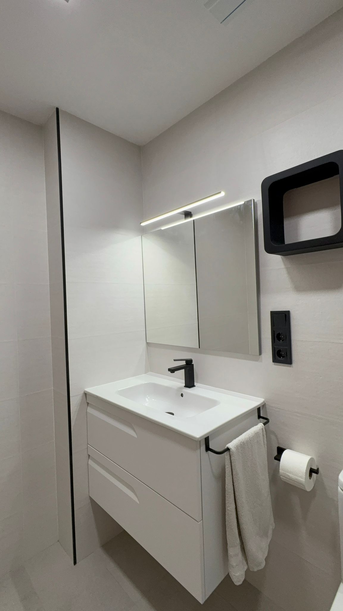 Para maximizar el espacio, instalamos el mueble Vitale suspendido de 80 cm en acabado blanco mate, con dos amplios cajones. Se complementa con un espejo liso y una luminaria LED en acabado negro.